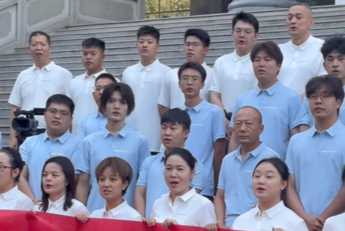 浙江省宁波市援疆干部、库车市融媒体中心职工与库车市萨克萨克街道惠民社区居民同唱《我和我的祖国》,表达对伟大祖国的祝福(2020年10月1日摄)。尼亚孜·热合曼摄