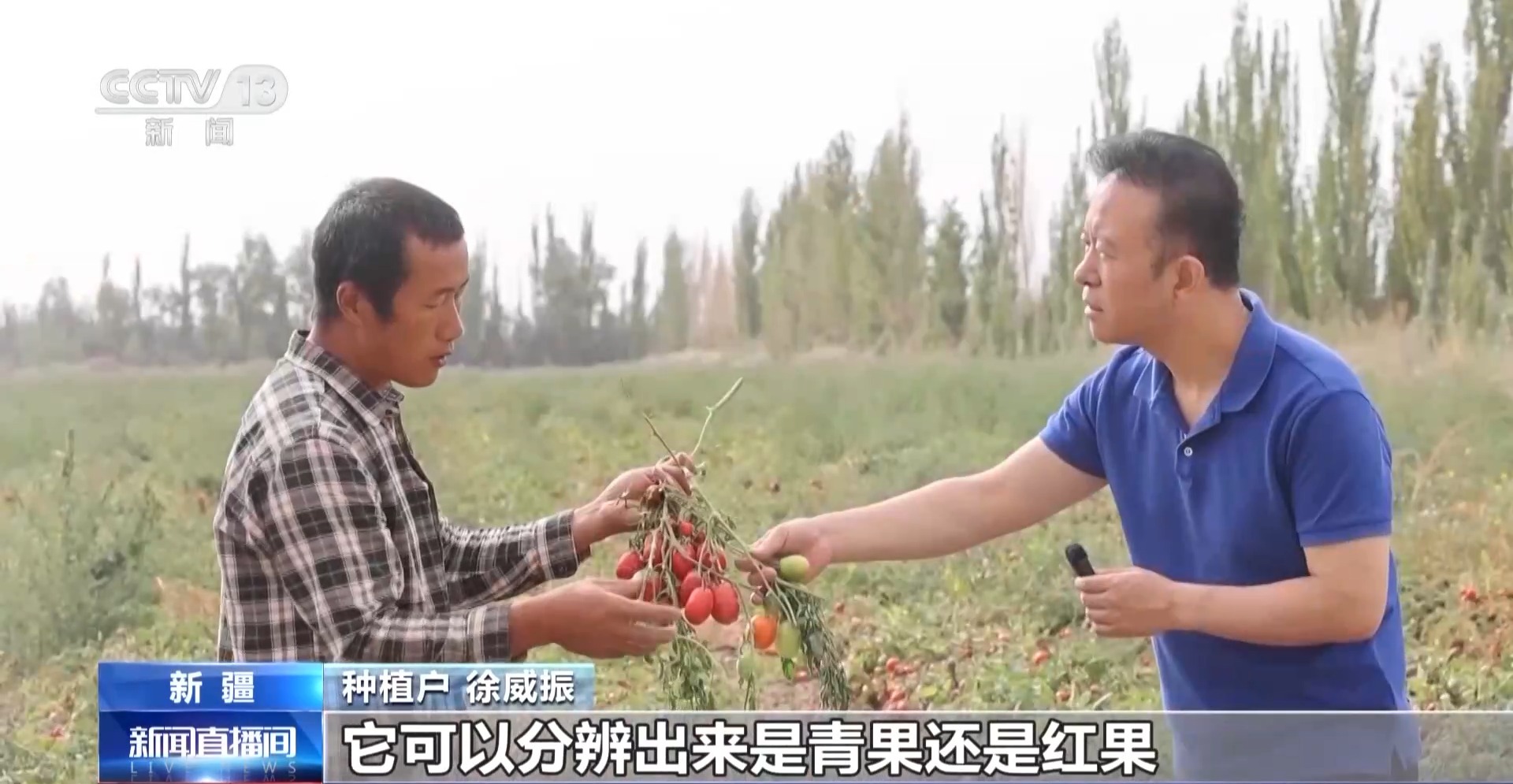 种植户 徐威振:采收机里面有一个专门的色选仪,就是用那个激光采收的,它可以分辨出来是青果还是红果,不合格的话它就弹掉了。