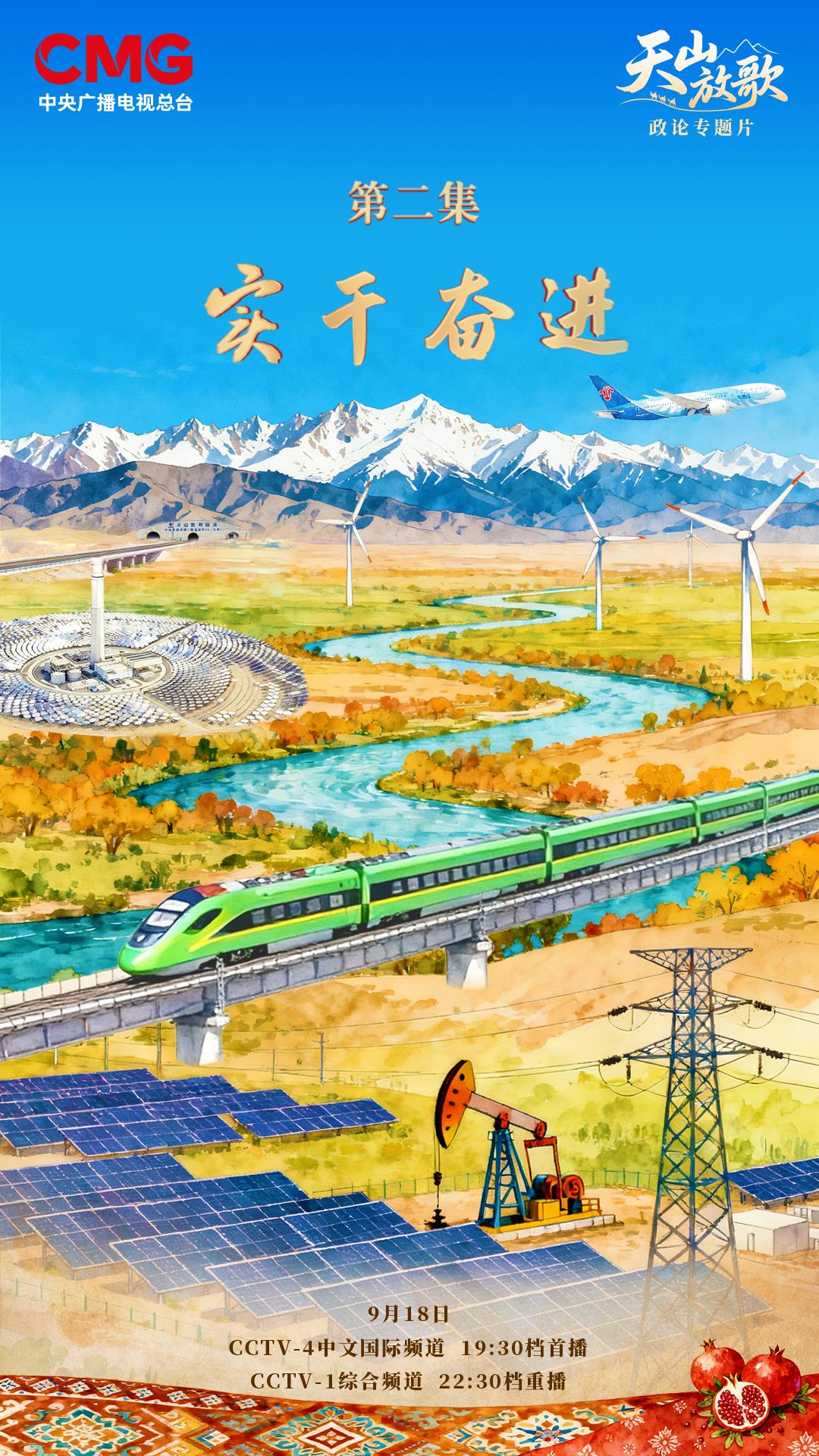 为庆祝新疆维吾尔自治区成立七十周年,中央广播电视总台摄制六集政论专题片《天山放歌》,今晚19:30,将在总台中文国际频道(cctv-4)播出第二集《实干奋进》,总台央视综合频道(cctv-1)22:30重播。该集内容聚焦新疆在交通、能源、水利、数字经济等领域的跨越式进步,以一个个生动的故事,展现新疆高质量发展与民生改善的崭新篇章。