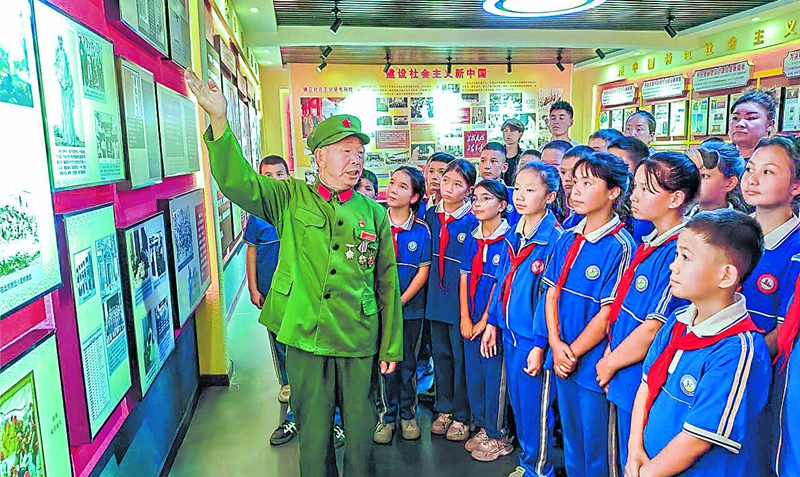 9月2日,阿瓦提县开展纪念中国人民抗日战争暨世界反法西斯战争胜利80周年活动,学生们在巴格托格拉克乡卡尔库杰克村红色教育基地听老兵讲述红色故事。包良廷摄
