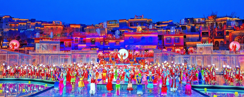演员在中央广播电视总台2024年春节联欢晚会新疆喀什分会场表演开场舞《鼓舞龙腾》(2024年2月9日摄)。天山网-新疆日报记者 约提克尔·尼加提摄