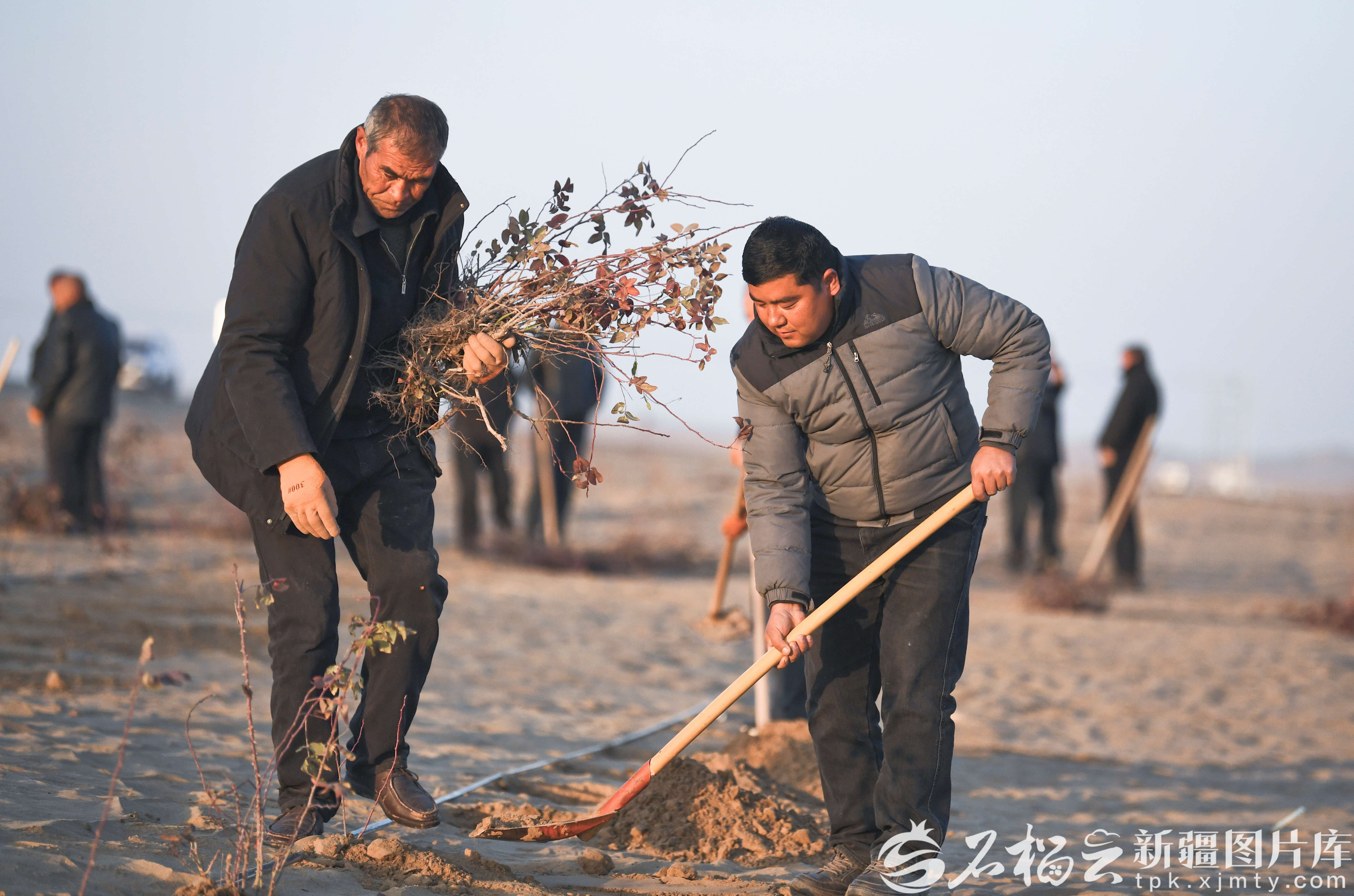 2024年11月28日上午,和田地区于田县奥依托格拉克乡托格拉吾斯塘村村民在万花园防沙治沙区种植沙漠玫瑰树苗。石榴云/新疆日报记者 汤永摄