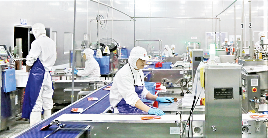 9月17日,在福建紫山集团股份有限公司生产车间,工人们在生产拌面酱料包。福建紫山集团股份有限公司供图