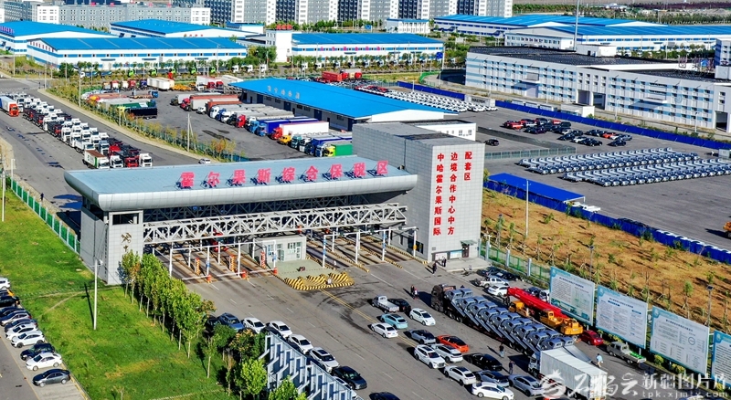 车辆在霍尔果斯综合保税区排队办理通关手续(2023年8月29日摄)。石榴云/新疆日报记者 蔡增乐摄