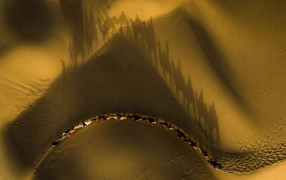 游客骑着骆驼在尉犁县罗布人村寨欣赏沙漠美景(无人机照片)。新华社记者 赵戈 摄