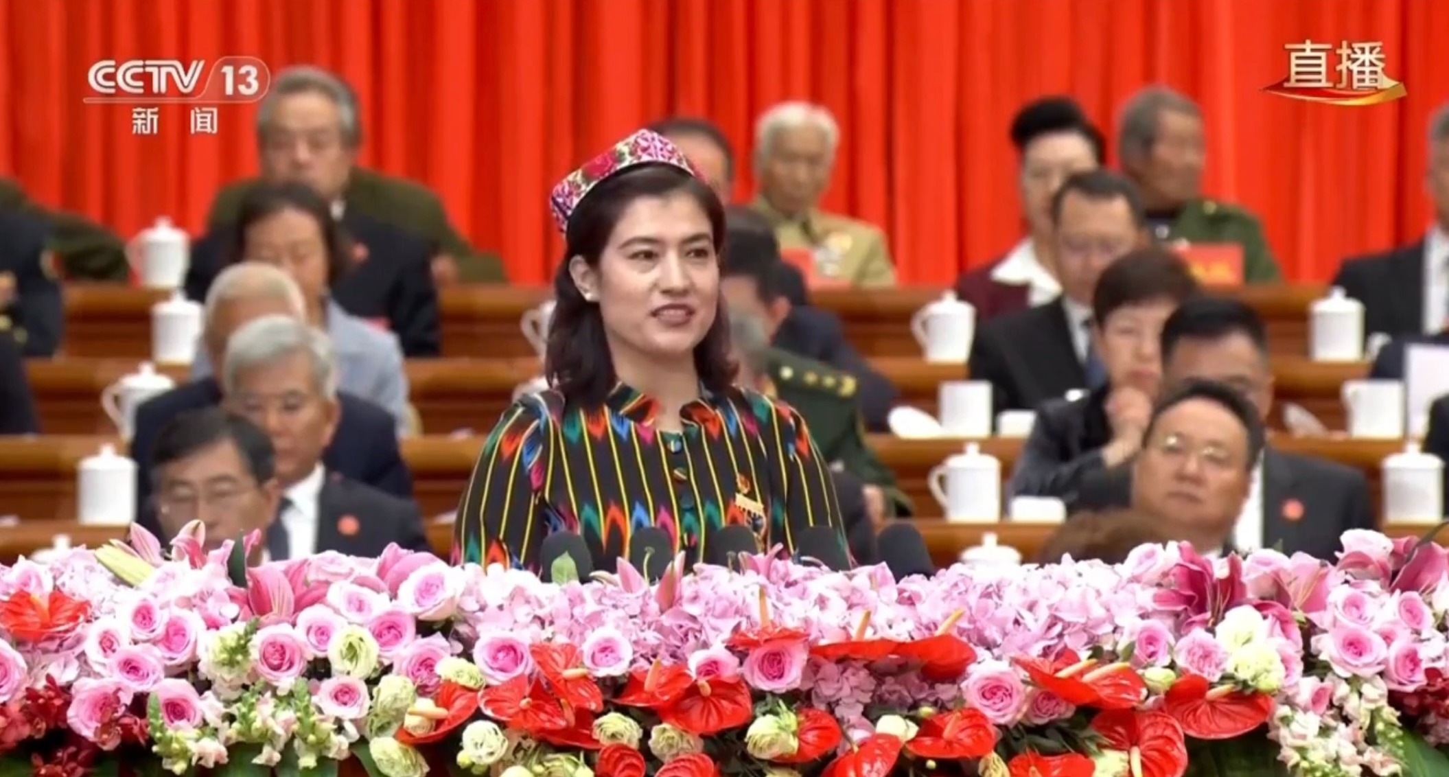 9月25日,喀什地区巴楚县童梦幼儿园党支部副书记、园长艾米拉古丽·阿不都在新疆维吾尔自治区成立70周年庆祝大会上发言。来源:央视新闻