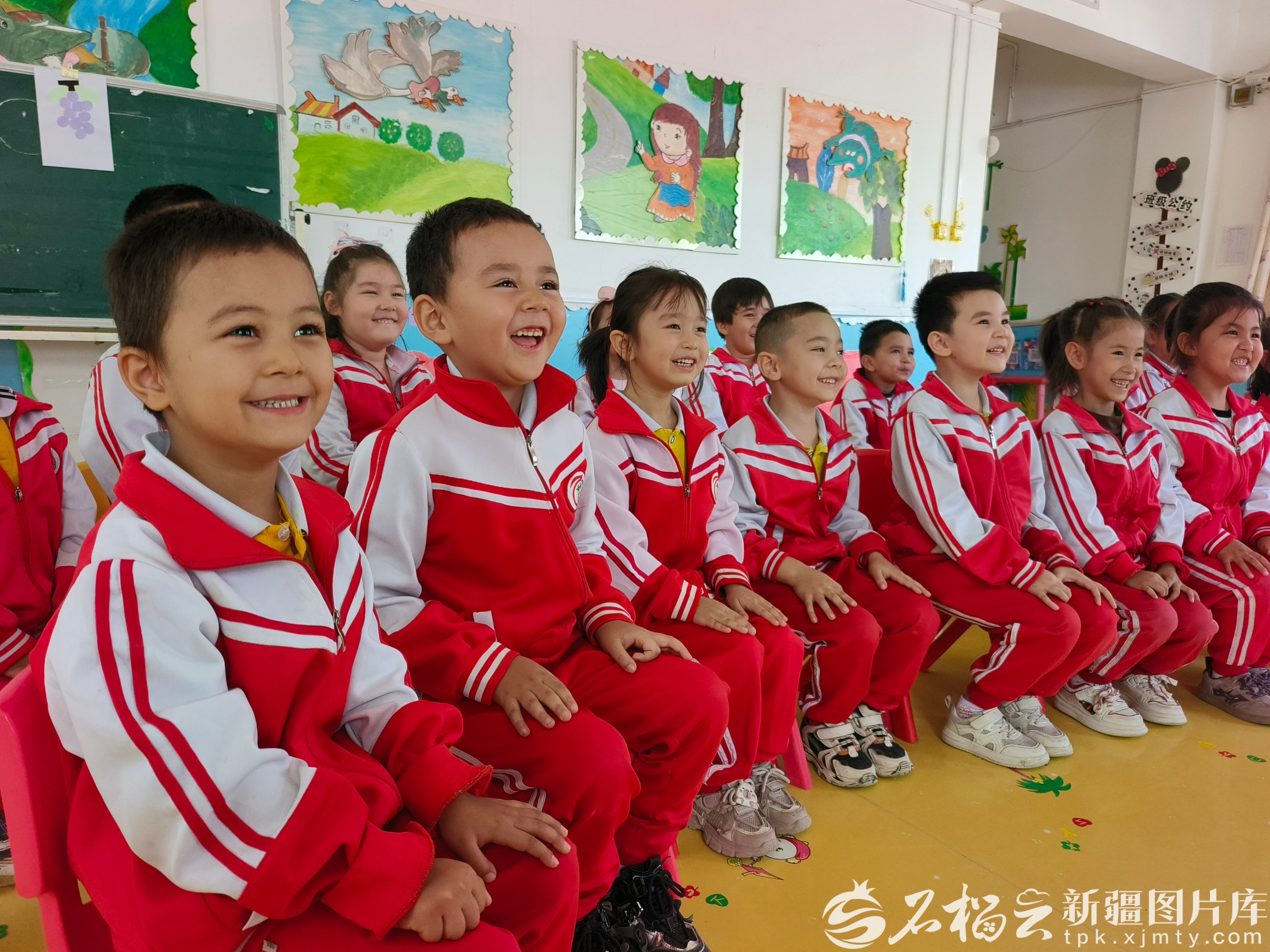 9月25日,巴楚县童梦幼儿园的孩子们在电视上看到参加新疆维吾尔自治区成立70周年庆祝大会的艾米拉古丽·阿不都,感到十分亲切,高兴地笑起来。热孜万古·艾合麦提摄