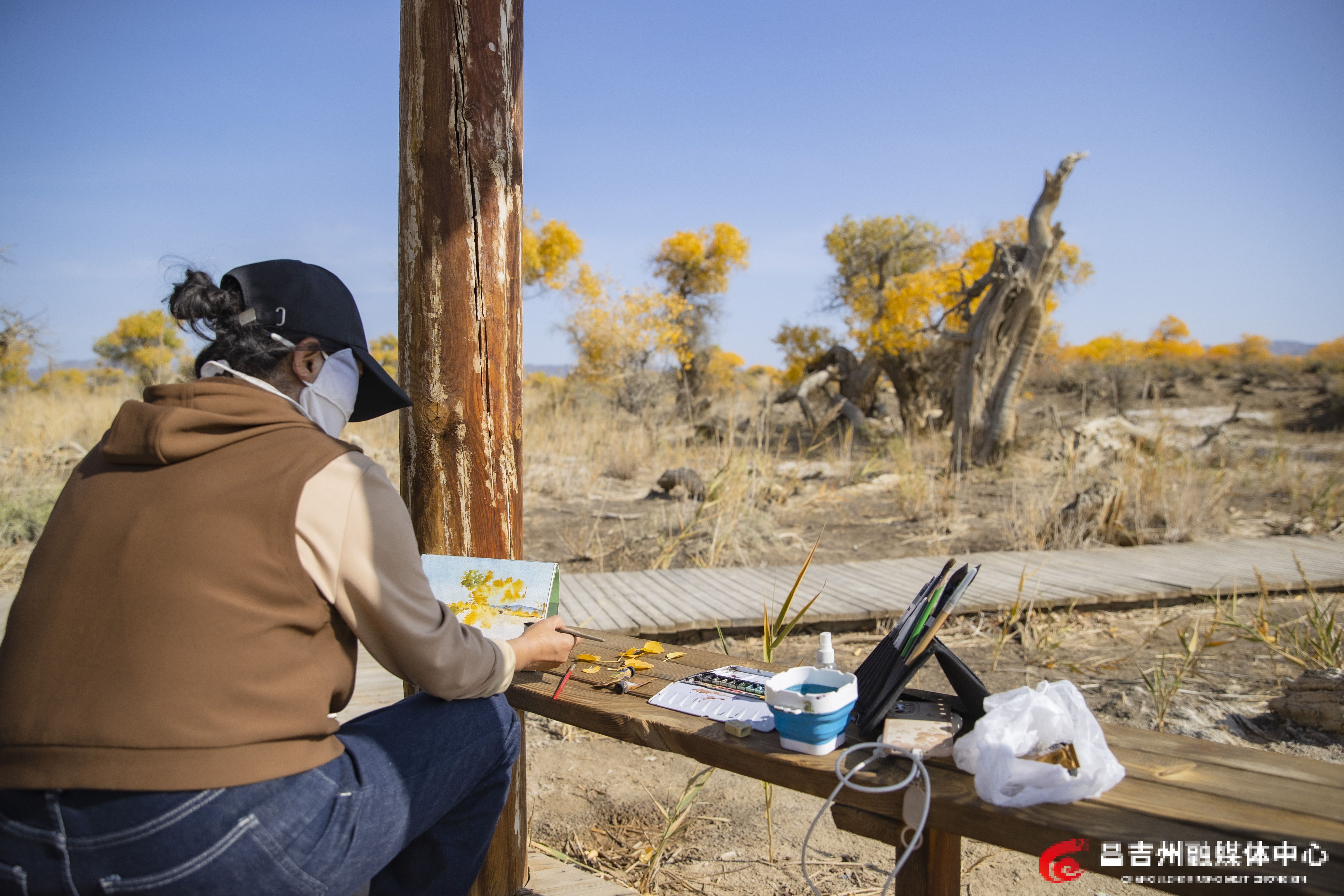 10月1日,在木垒县胡杨林景区,游客在写生。