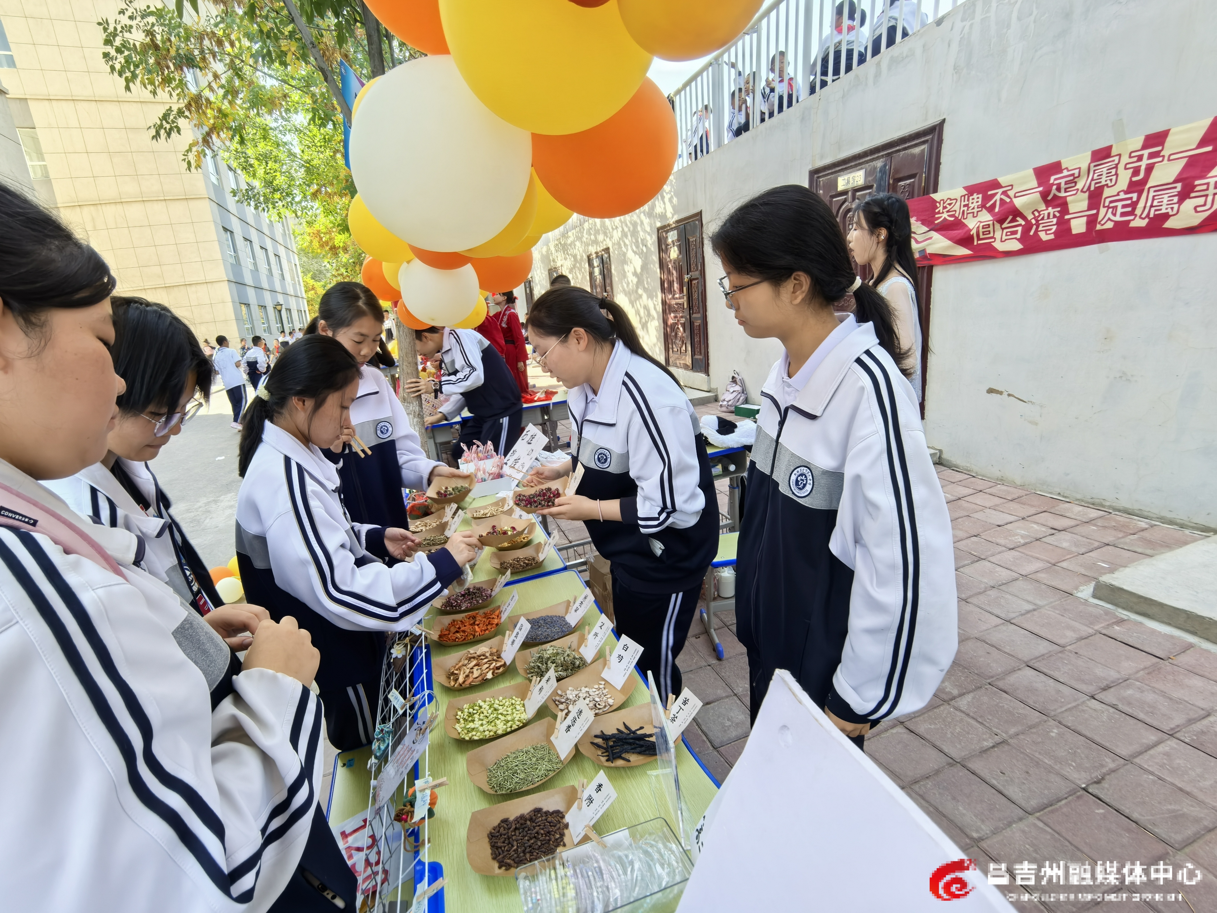 9月28日,昌吉市第九中学第四届秋季运动会开幕,义卖摊位前同学们向来往学生介绍中草药。记者王硕 摄