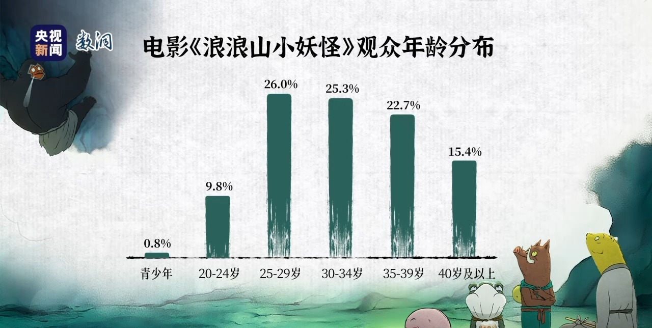 根据网络平台的数据,今年暑期档中,国产动画电影《浪浪山小妖怪》的观众中,25到29岁的年轻人占比最高,达到26%。他们中很多不是陪孩子来看的爸妈,而是自己真心想看的核心观众。