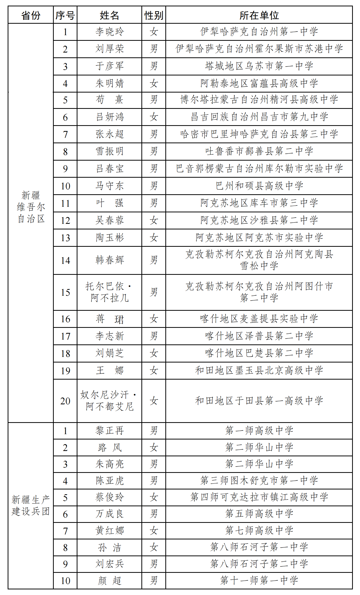 a a. a-近日,教育部网站公布了首批全国县域普通高中头雁教师岗位计划入选教师名单,共计600人,其中新疆(含兵团)30人(完整名单如下)。