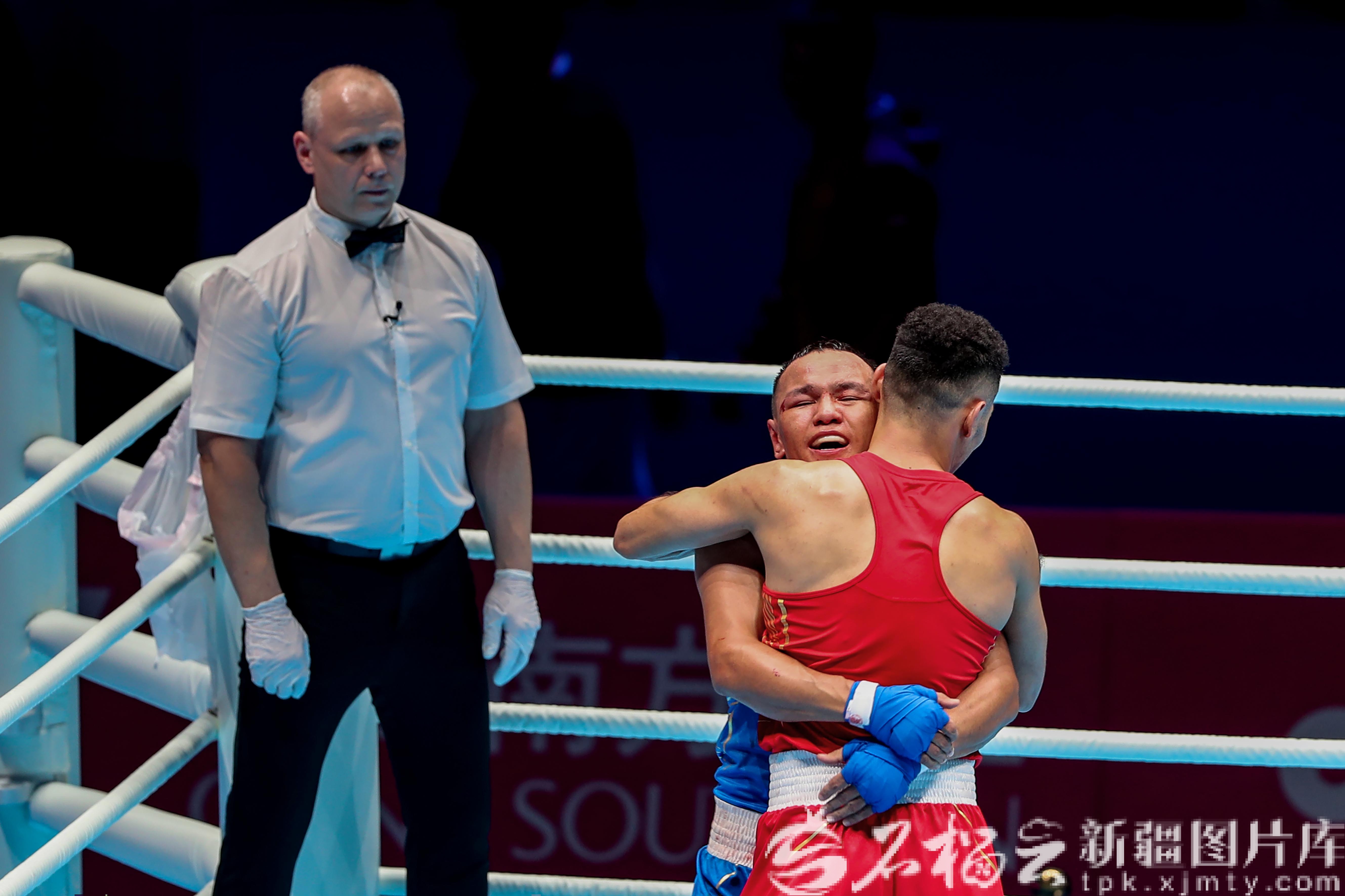 11月13日,新疆拳击队运动员叶尔达吾列提·买依兰别克(蓝)获胜后和对手乌勒怕尔·哈尔恒拥抱在一起。