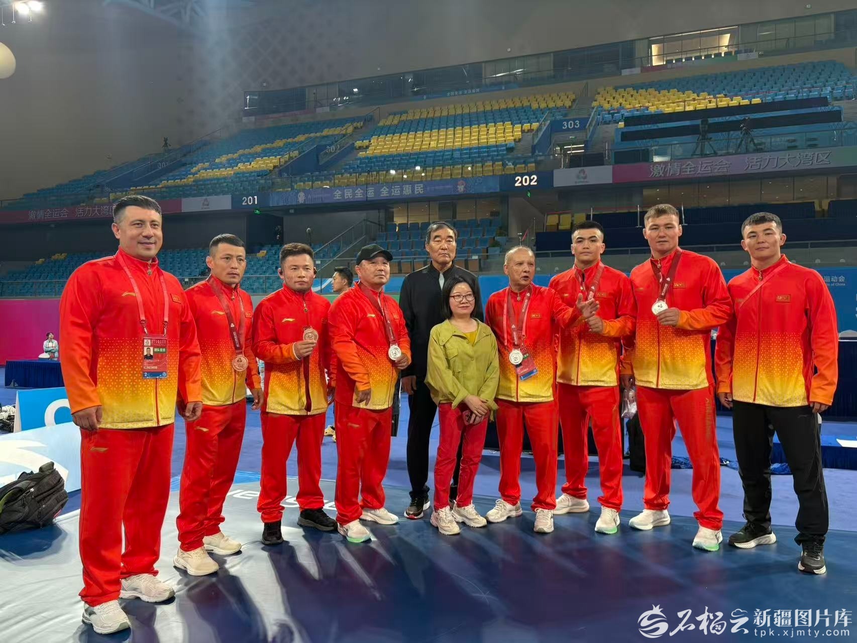 第十五届全国运动会上,新疆摔跤队队员们获得多枚奖牌。石榴云/新疆日报 记者王晶晶摄