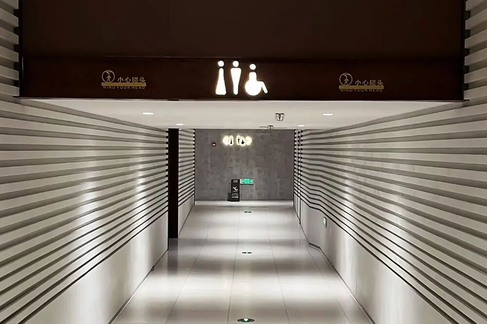11月6日,在广西柳州市群众艺术馆,参观者走入公共卫生间。该卫生间标识用民族服饰展示文化特色,中英文文字提供准确信息。