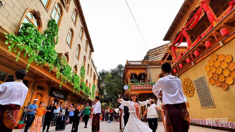 傍晚时分,团城的“昆仑诗灯”渐次亮起,诗词灯影与特色建筑相映成趣。加玛力·加拉力丁的乐器店飘出欢快的旋律,游客们随着音乐翩翩起舞。