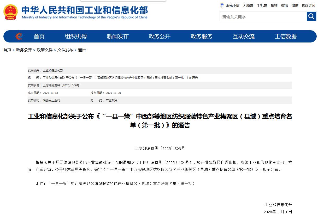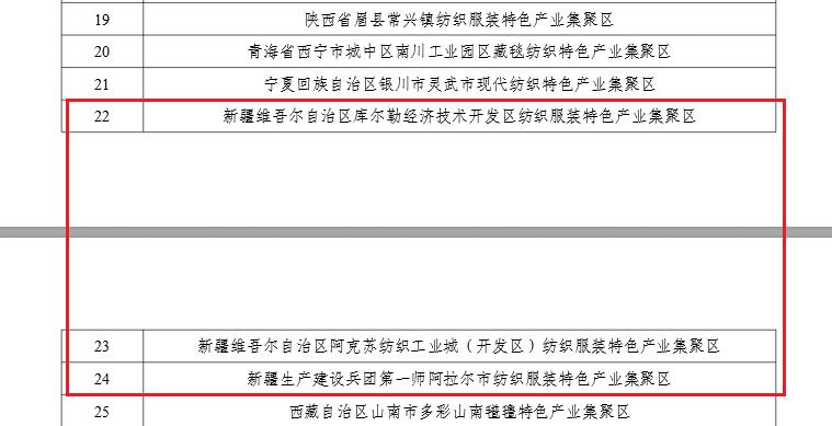 a a. a-11月20日,工业和信息化部网站公布了第一批“一县一策”中西部等地区纺织服装特色产业集聚区(县域)重点培育名单。其中,新疆有3地入选,分别是:库尔勒经济技术开发区纺织服装特色产业集聚区、阿克苏纺织工业城(开发区)纺织服装特色产业集聚区、兵团第一师阿拉尔市纺织服装特色产业集聚区。