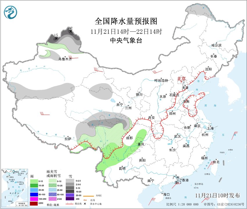 新疆气象台预报显示,21日夜间到22日白天,北疆大部、哈密市和阿克苏地区北部山区、巴州北部山区、昆仑山北坡等地的部分区域有小雨或雨夹雪转雪,其中伊犁河谷东部南部山区、塔城地区、阿勒泰地区山区、石河子市南部山区、乌鲁木齐山区、昌吉州、哈密市北部山区的部分区域有中到大雪,伊犁河谷东部山区、塔城地区北部山区、昌吉州山区、哈密市北部山区局地暴雪;上述大部区域有4~5级西北风,风口风力9~10级。全疆其他地区以晴或多云天气为主,风力不大。