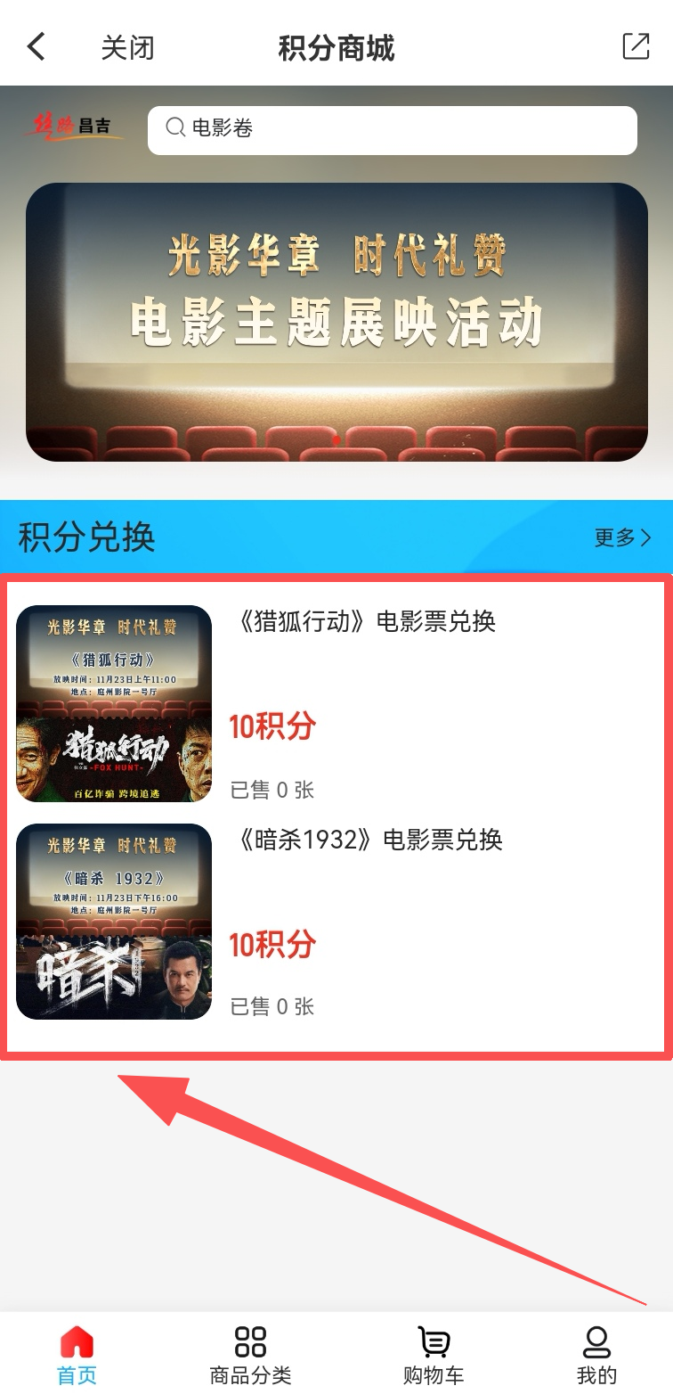 在丝路昌吉客户端“尊龙凯时国际娱乐首页”,点击“积分商城”→点击想看的电影→兑换电影票。