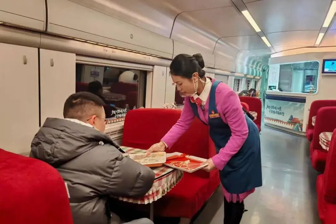 夜间运行时段,列车推行“轻语服务”,软卧车厢启动“免打扰模式”。乘务人员统一使用降噪对讲机并佩戴耳机沟通,全力营造静谧的夜间环境,更设有“深夜食堂”,让旅客在深夜也能品尝到家乡风味,真正做到“深夜不打烊,胃暖心更安”。