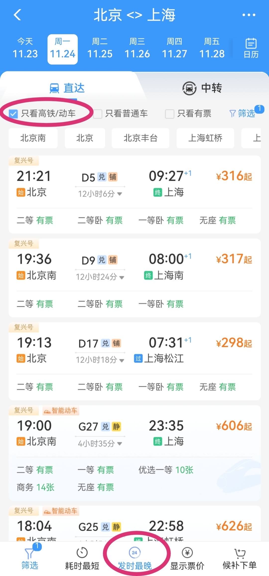 勾选“只看高铁/动车”