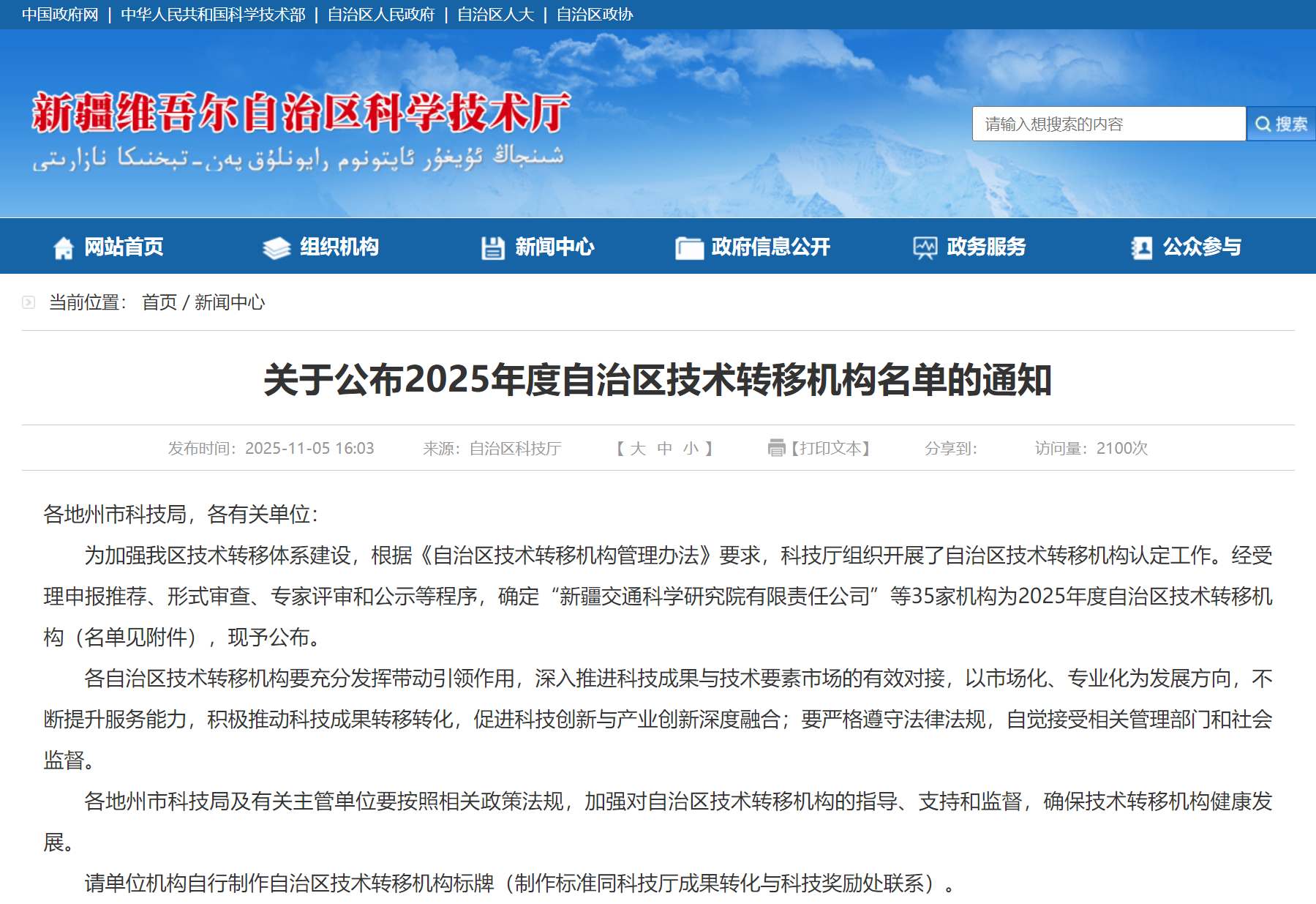 a a. a-天山网-新疆日报讯(记者谢慧变报道)日前,自治区科技厅正式公布2025年度自治区技术转移机构名单,新疆交通科学研究院有限责任公司、新疆大学技术转移中心等35家机构入选。