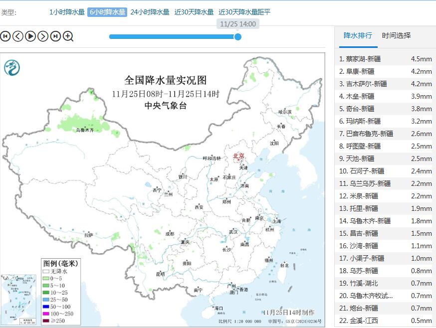 a a. a-石榴云/新疆日报讯 11月25日8时至14时,新疆霸榜全国降水排行榜,前18名都是新疆的站点。