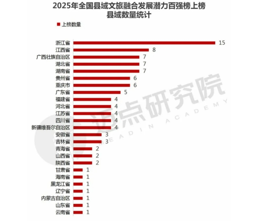 2025年全国县域文旅融合发展潜力百强县分布在25个省市自治区。其中,浙江占15席,江西占8席,广西壮族自治区、湖北、湖南各占7席,贵州和重庆各占6席,广东占5席。