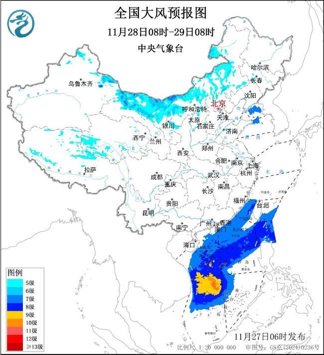 预计,11月27日8时至28日8时,新疆东部、内蒙古中西部、甘肃西部、宁夏北部、山东半岛、江苏沿海以及青海西南部、西藏中西部等地有5~7级大风,阵风8~9级,其中新疆东部山口地区、内蒙古西部部分地区风力可达8级,阵风9~10级;11月27日8时至28日8时台湾海峡、巴士海峡、南海北部和中东部海域将有8级、阵风9级的东北风,其中南海中西部和西南部海域的风力可达10级、阵风11级,南海中东部海域的风力可达9级、阵风10级,南海东南部海域将有8级、阵风9级的东南风。