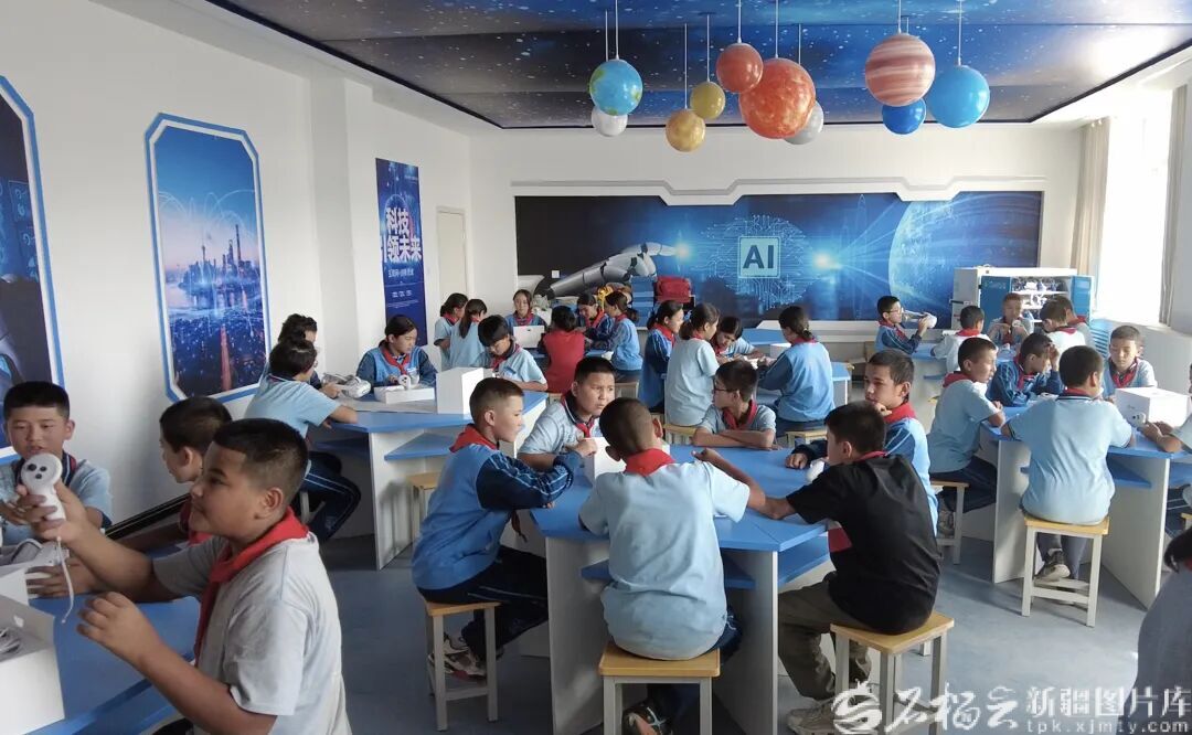 乌什县依麻木镇国家通用语言小学的学生学习使用ar眼镜。中国联通新疆分公司供图