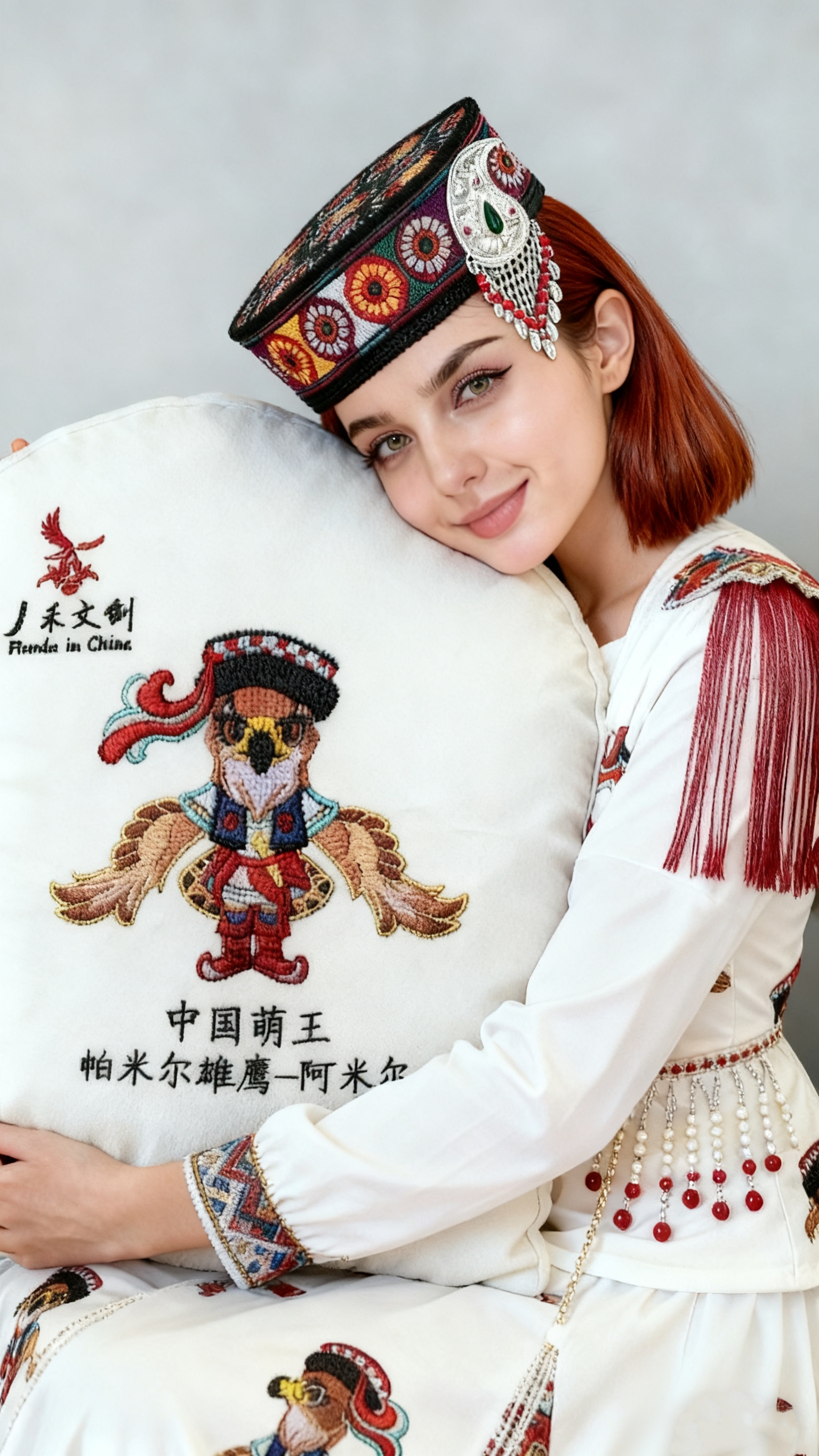 11月13日,上海。中国吉祥物大赛暨在地文创ip萌趣大赛总决赛现场,喀什大学丿禾文创工作室教师百合提妮莎·甫拉提夏身着塔吉克族盛装,带着“帕米尔雄鹰——阿米尔”吉祥物走上颁奖台。这个以鹰为原型、融合塔吉克族传统文化的ip形象,从全国300多个城市参赛作品中脱颖而出,斩获“最具文化传播力”ip之王奖项,并获“中国萌王”称号。