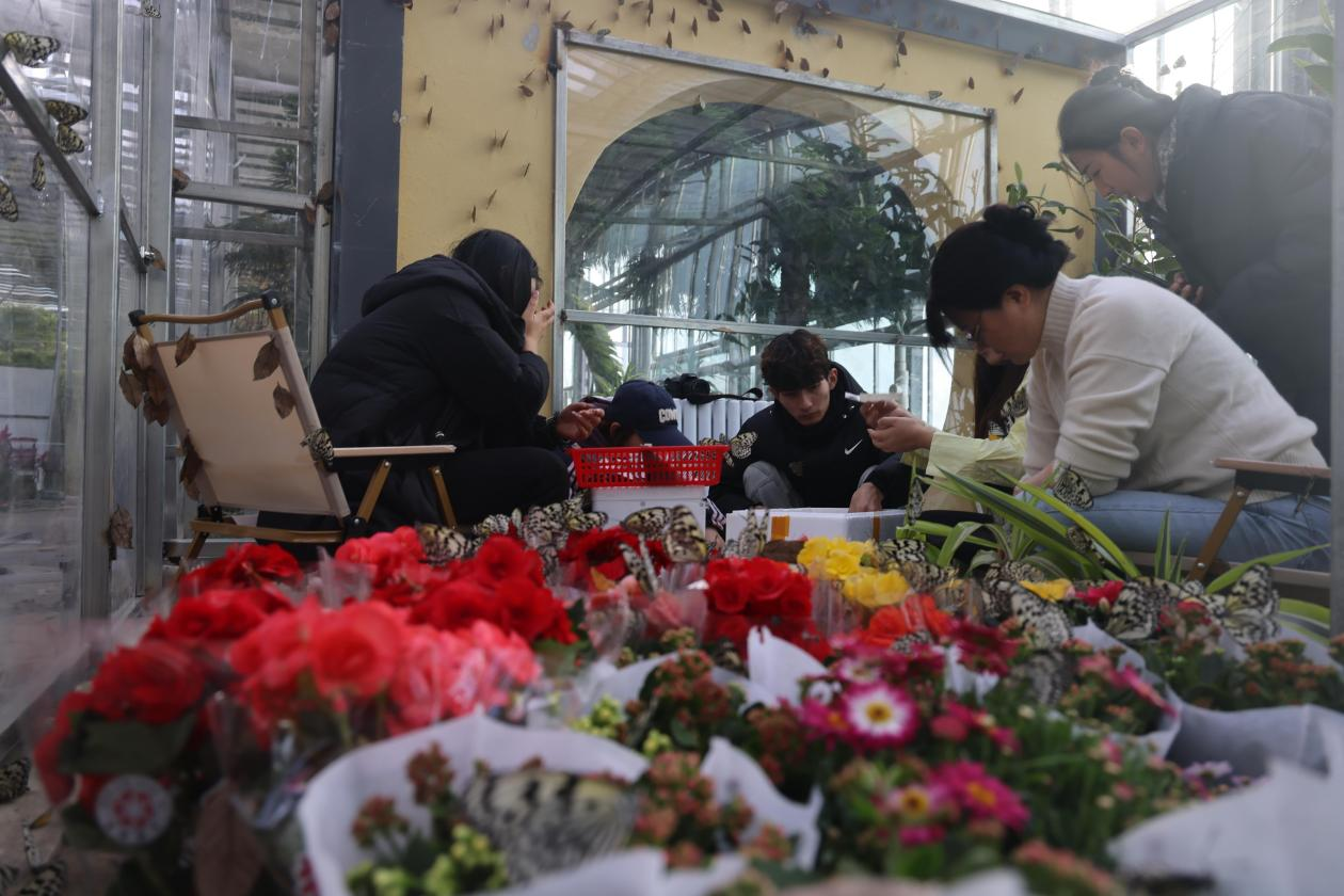 走进馆内,阵阵暖意扑面而来。各式绿植郁郁葱葱、枝繁叶茂,池水中的观赏鱼自在游动,生机勃勃。施工人员正忙着为植物生长区域加装阳光板,在保障充足透光性的同时,有效减少热量流失,为动植物营造稳定适宜的生长环境。温房内,工作人员正小心翼翼地将蝴蝶逐一放出,蝴蝶或舒展翅膀适应环境,或停落于鲜花之上吸食花蜜,姿态翩跹惹人喜爱。馆内同步开展的直播宣传,已吸引不少市民游客提前闻讯赶来,抢先感受蝴蝶环绕的浪漫氛围。