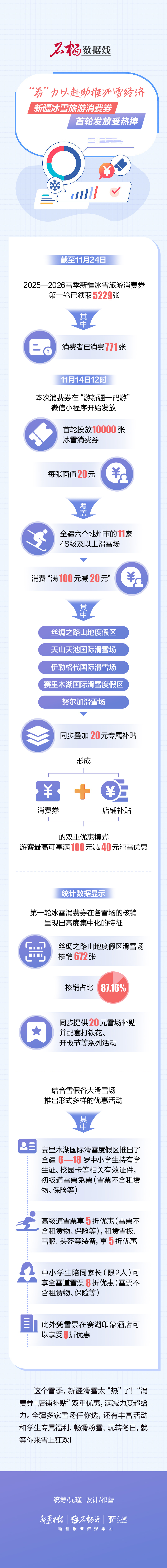 截至11月24日,2025—2026雪季新疆冰雪旅游消费券第一轮已领取5229张,其中消费者已消费771张。