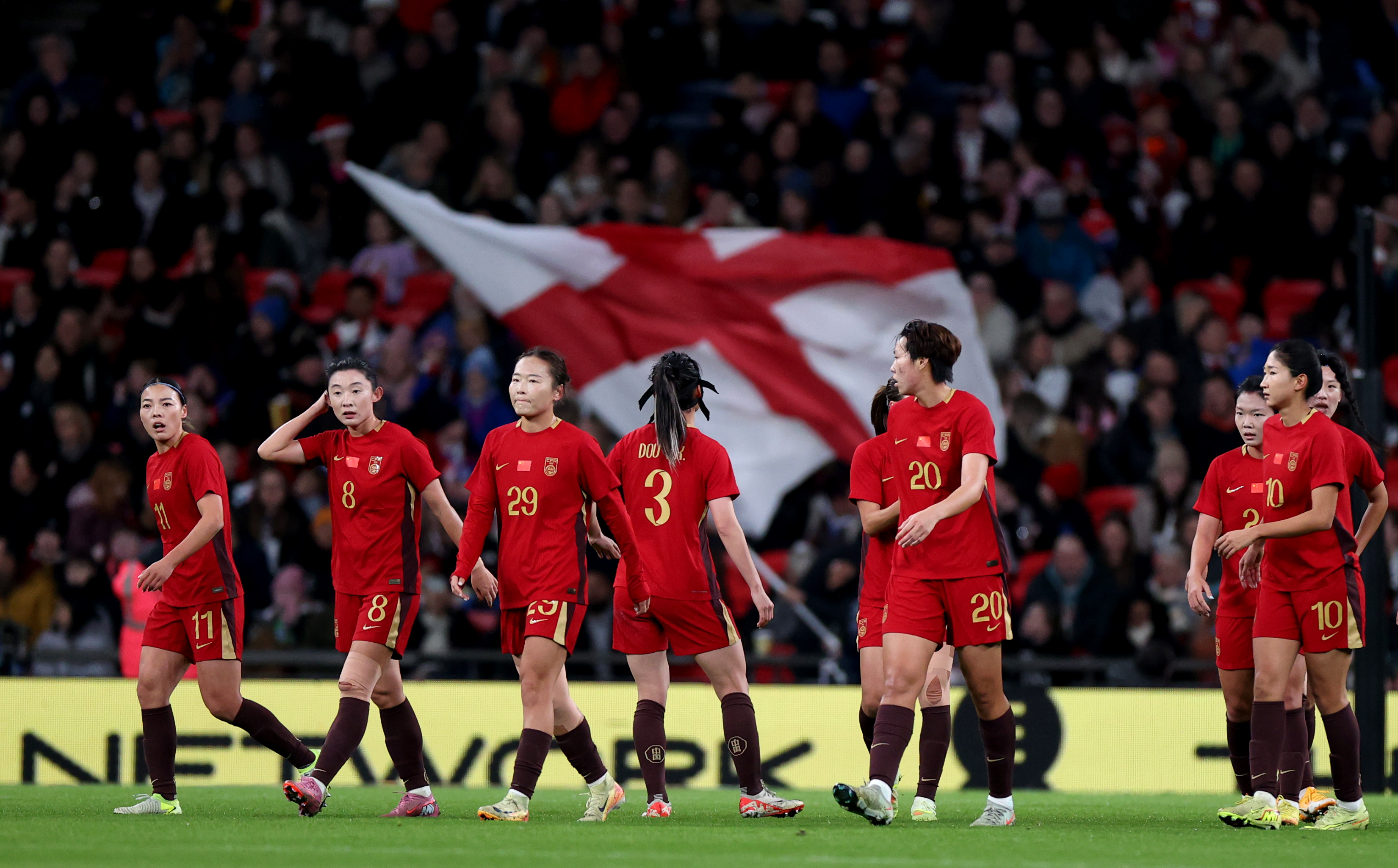 11月29日,中国女足球员在英格兰队球员进球后。新华社记者 李颖 摄