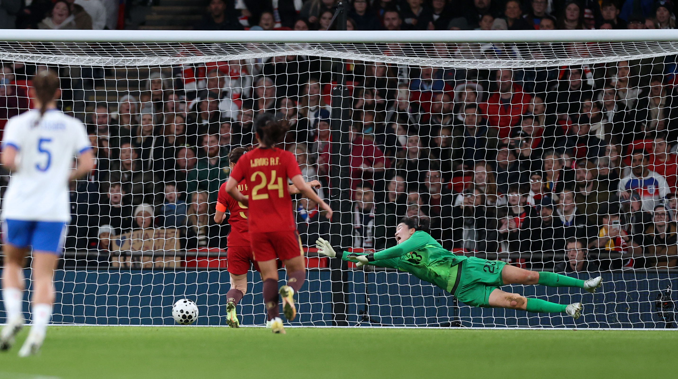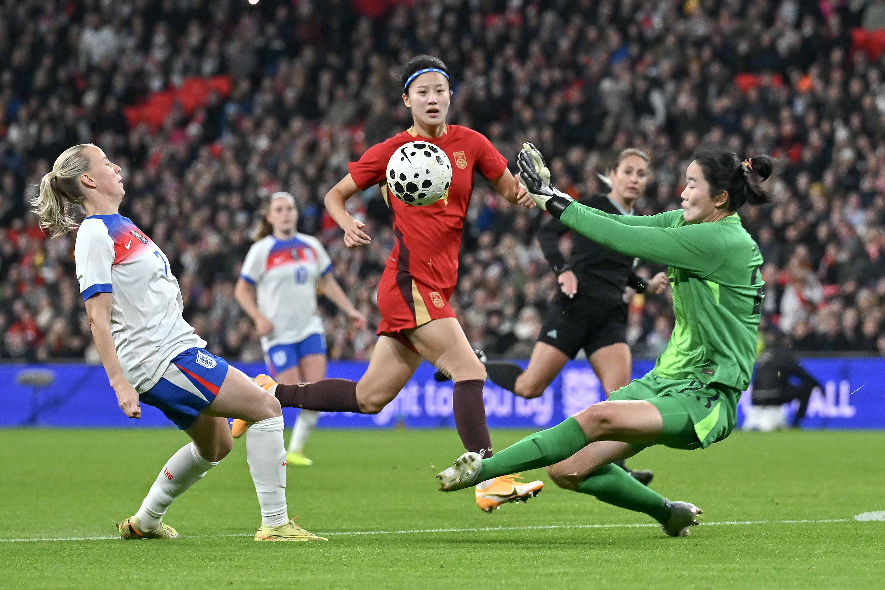 11月29日,中国队门将潘红艳(右)未能扑出英格兰队球员的射门。 新华社记者 李颖 摄
