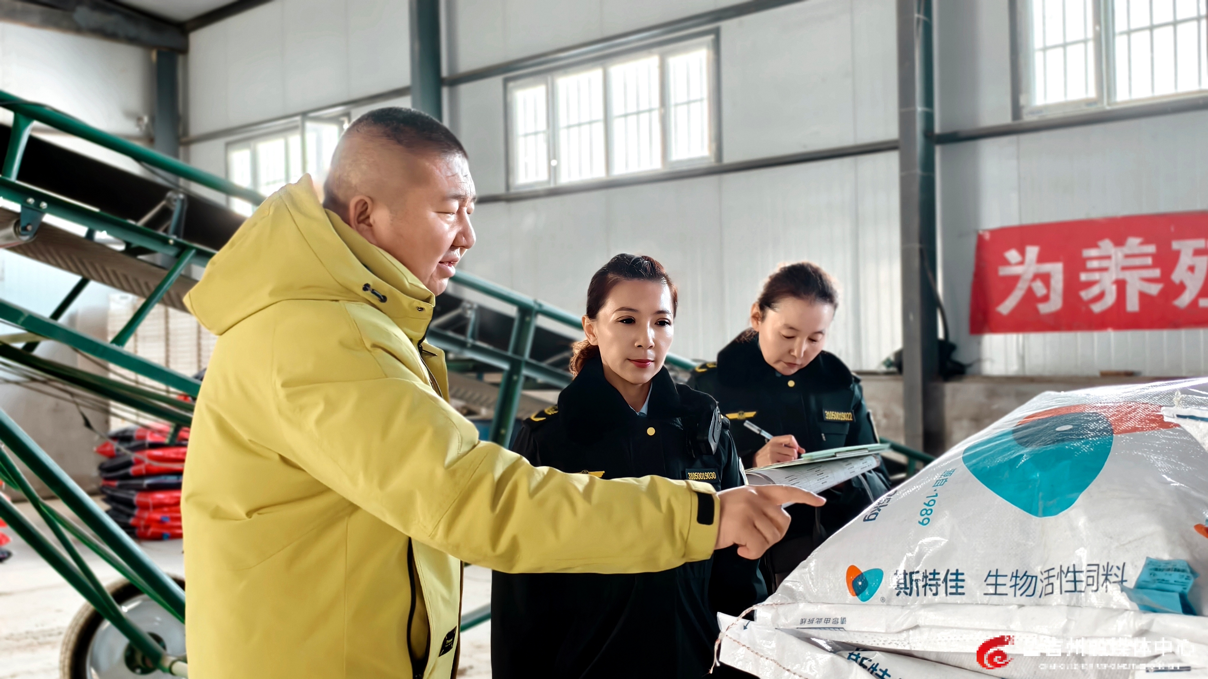 12月1日,在昌吉市鑫洋渔业专业合作社库房,昌吉州农业综合行政执法支队执法人员检查鱼饲料等投入品。记者王薇 摄