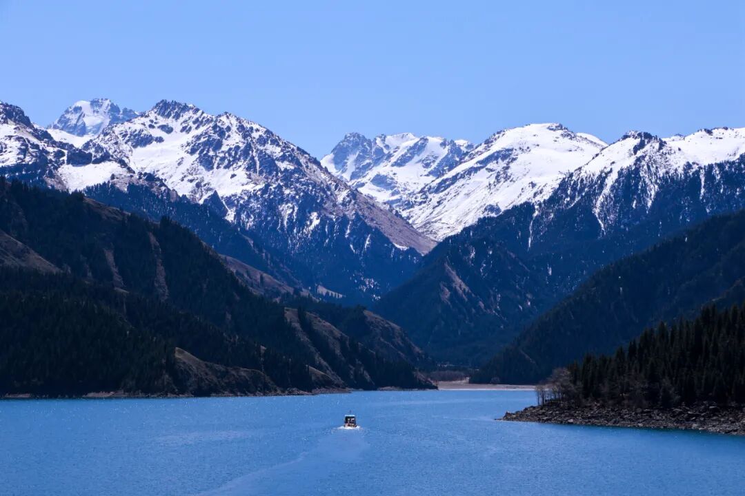 天山天池景区位于昌吉回族自治州阜康市,冬天更有别样的美景。远处的博格达峰裹着雪衣,天池湖水倒映着银装,宛如一幅流动的水墨丹青。