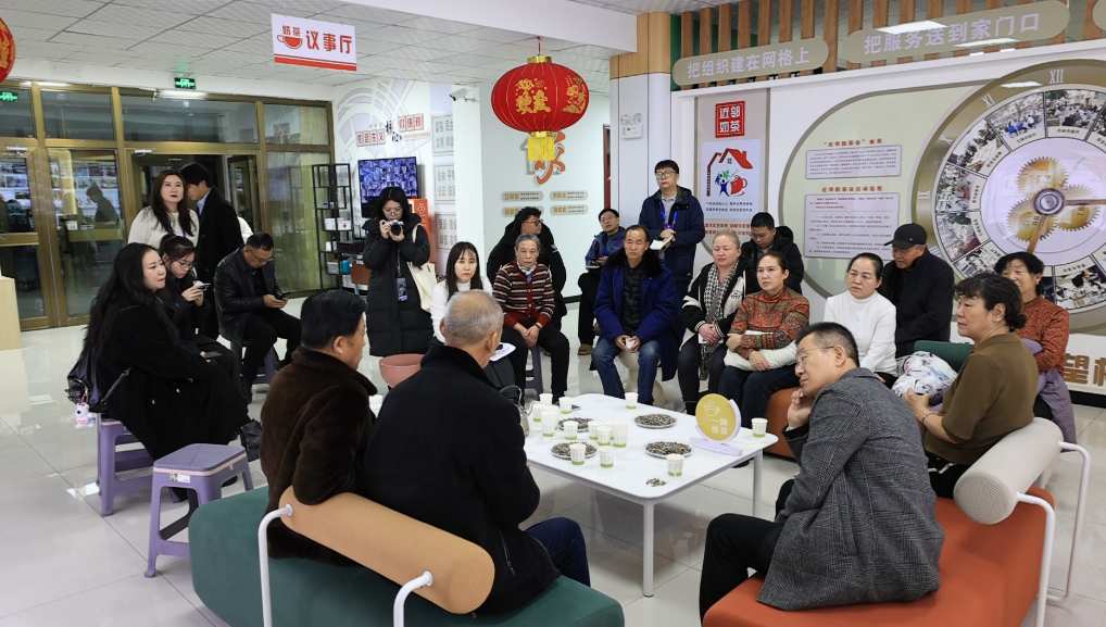 采访团成员与社区居民围坐在一起,参加“近邻奶茶会”。马凯雄 摄