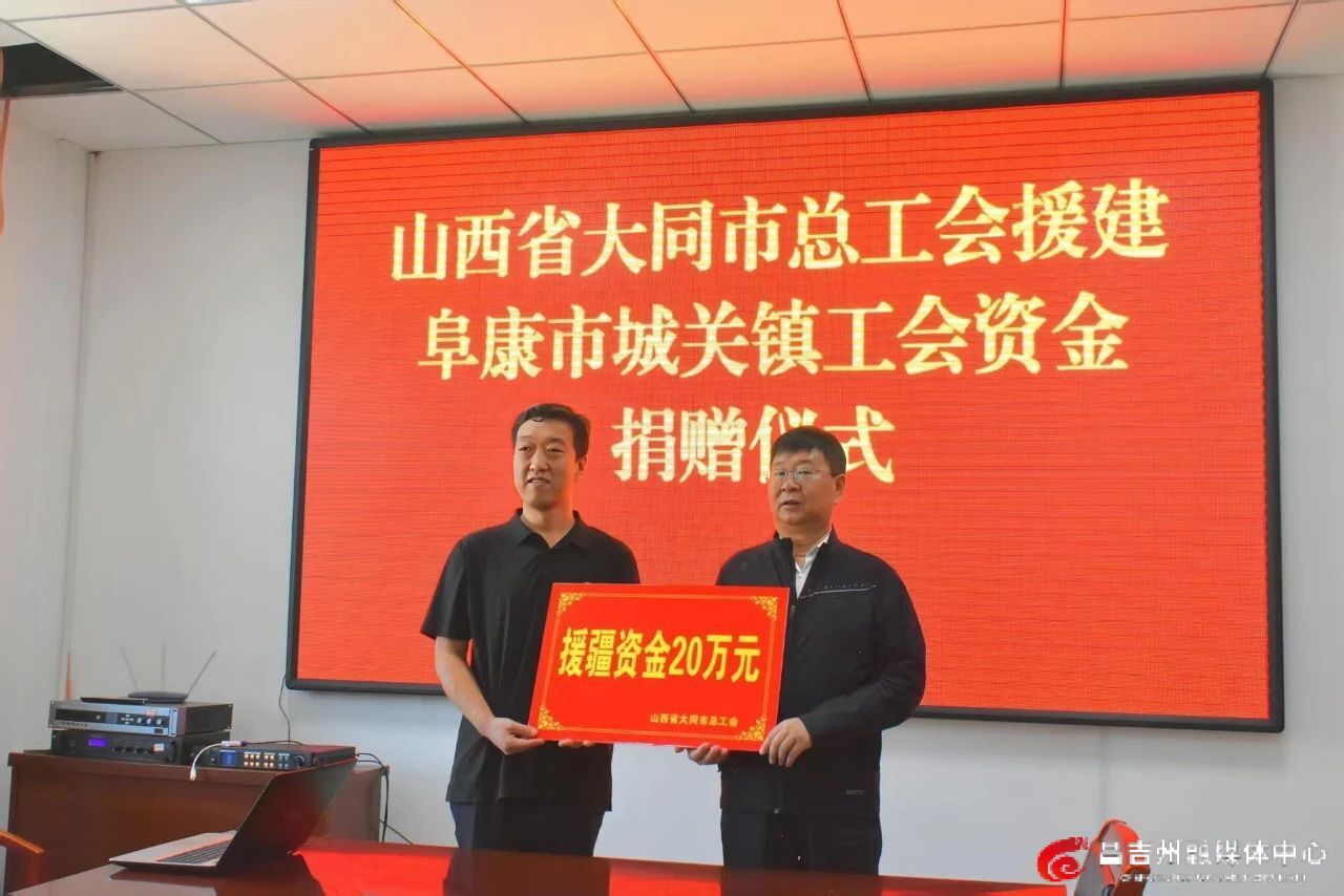 山西省大同市总工会援建阜康城关镇工会资金捐赠仪式。资料图。