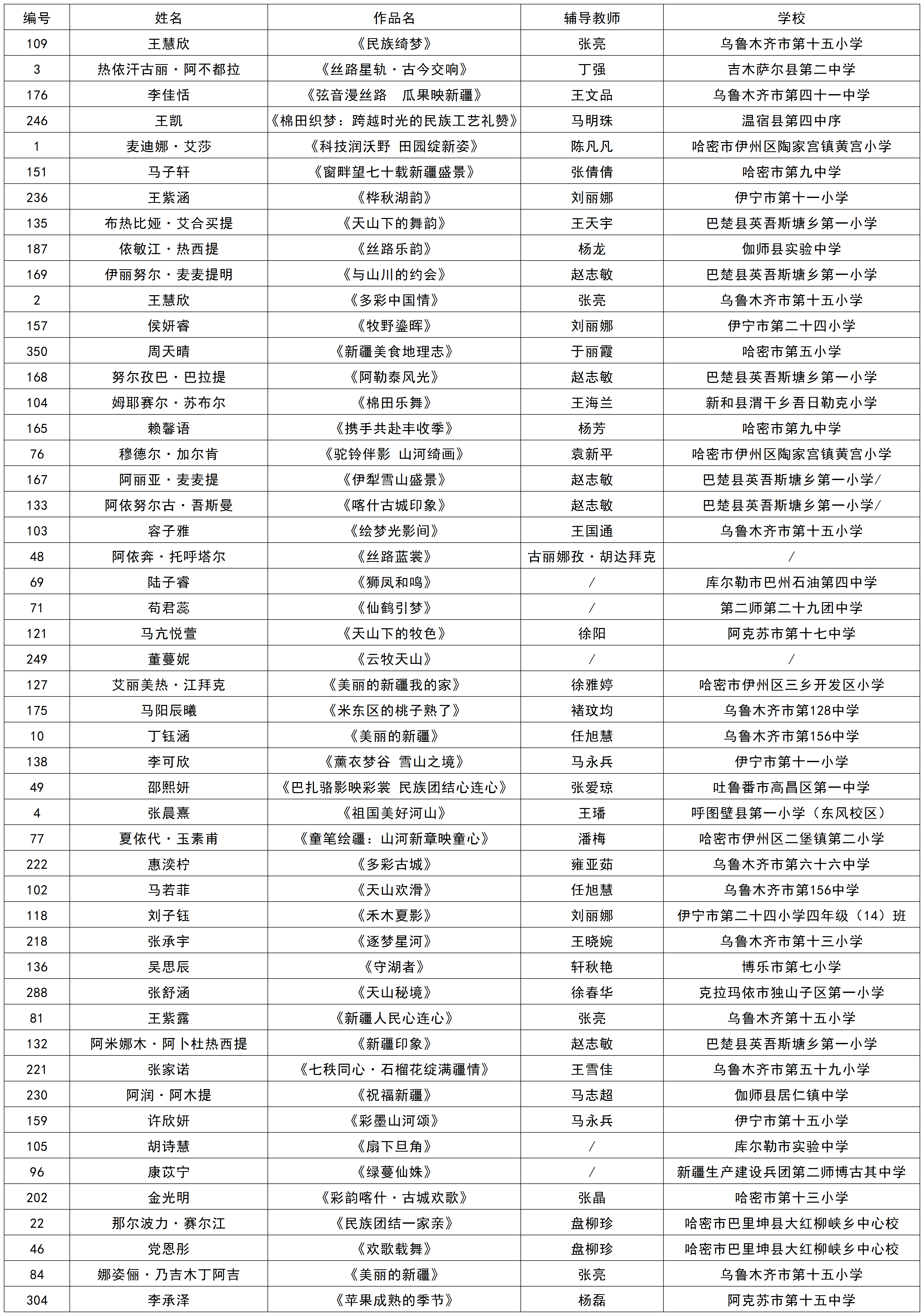 同时,为表彰在活动组织中表现突出的单位,特授予以下学校“优秀组织奖”:哈密市第十一中学、乌鲁木齐市第156中学、呼图壁县第一小学(东风校区)、哈密市第五小学、巴里坤县大红柳峡乡中心校、哈密市第六中学、乌鲁木齐市第十五小学、巴楚县英吾斯塘乡第一小学、阿克陶县小石榴幼儿园、哈密市第九中学。