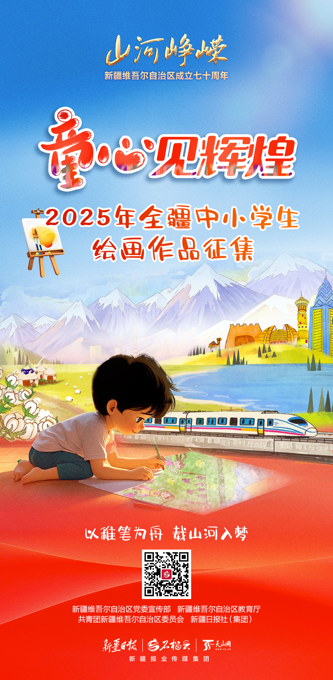 稚笔绘山河,童心映辉煌。12月3日,由新疆维吾尔自治区党委宣传部、新疆维吾尔自治区教育厅、共青团新疆维吾尔自治区委员会、新疆日报社(集团)联合主办的“山河峥嵘·童心见辉煌”2025年全疆中小学生绘画作品征集活动,在历经数月征集、初审、网络展选与专家评审后,圆满落下帷幕。