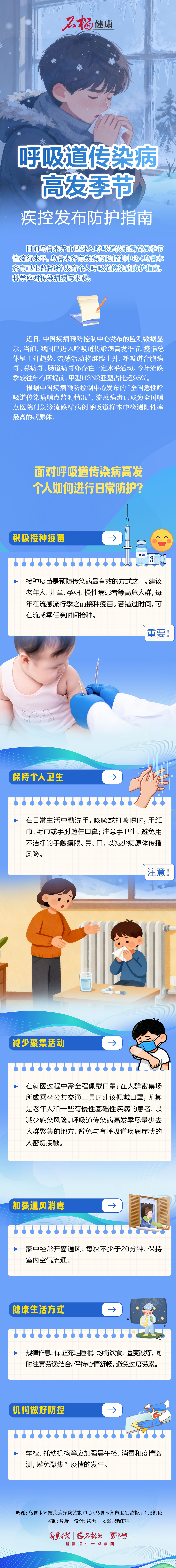 目前乌鲁木齐市已进入呼吸道传染病高发季节性流行水平。乌鲁木齐市疾病预防控制中心(乌鲁木齐市卫生监督所)发布个人呼吸道传染病防护指南,科学应对传染病病毒来袭。