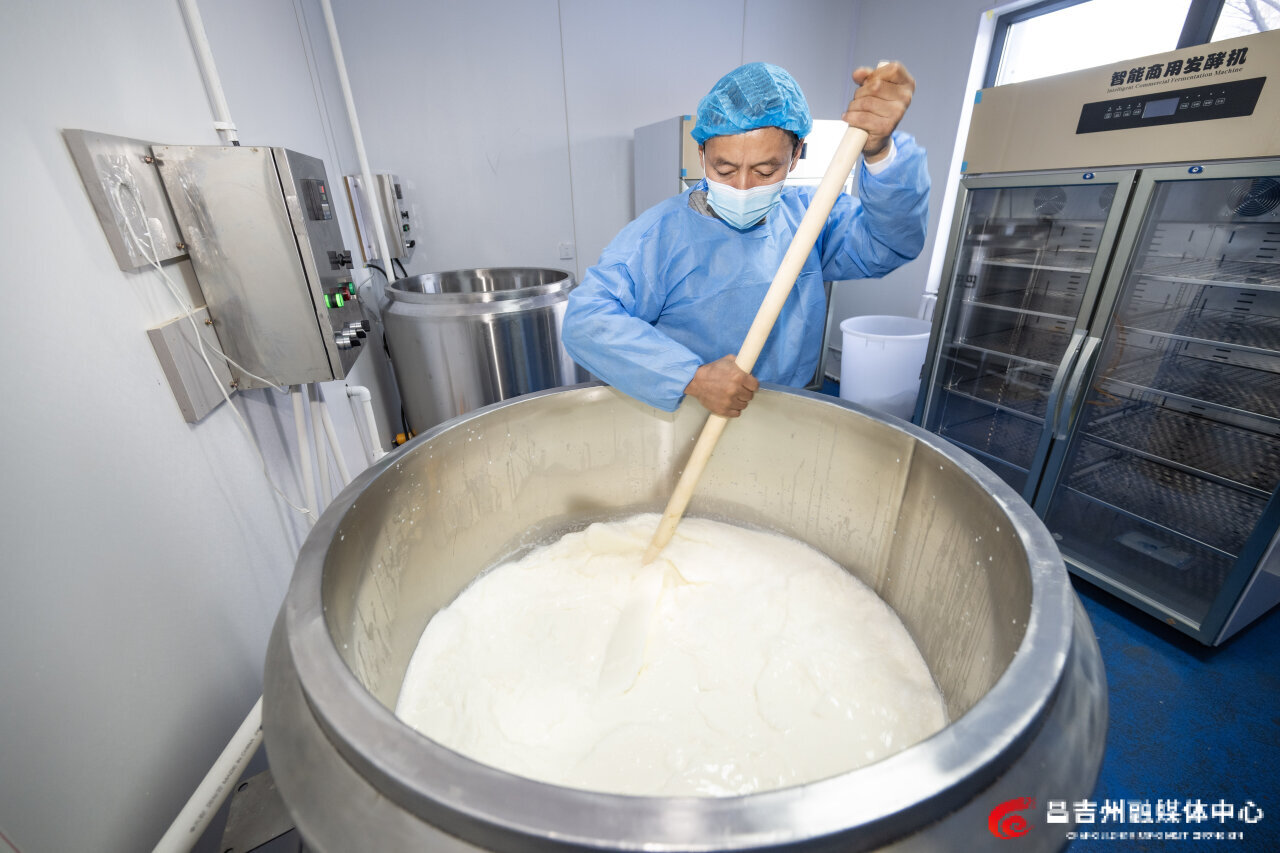 12月3日,奇台县香可儿食品加工厂,工作人员在制作奶皮子酸奶。