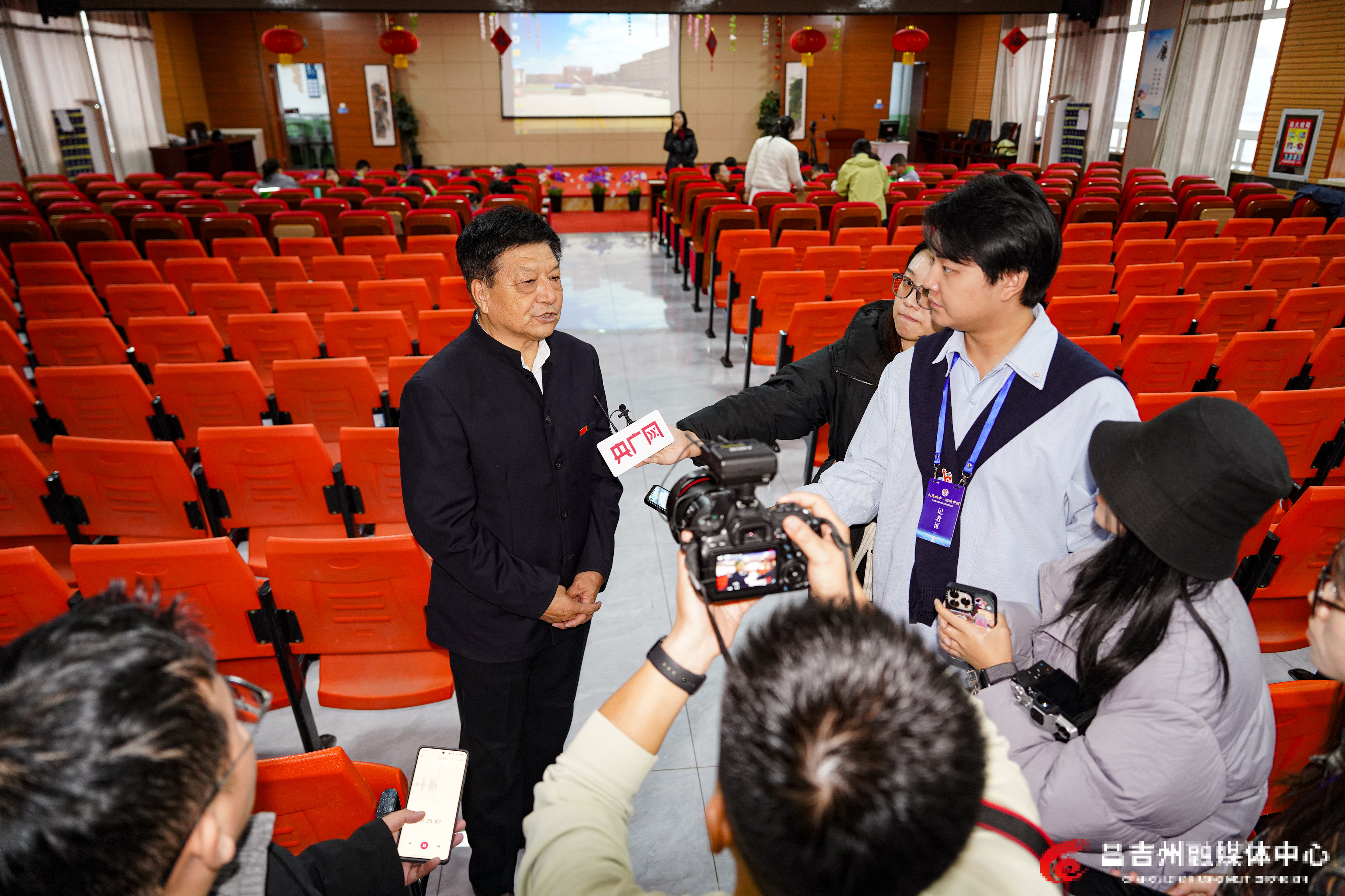 11月26日,张进元给“人民城市·温情中国”吉木萨尔篇网络主题宣传活动的记者们讲述自己入校园普及戏曲文化的故事。记者常谊谊 摄