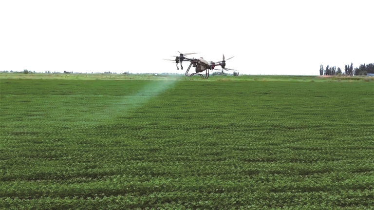 在玛纳斯县乐土驿镇黑梁村棉田里,植保无人机按照预先规划好的飞行路径,进行飞防作业。□瓦力斯江·乌马尔江摄