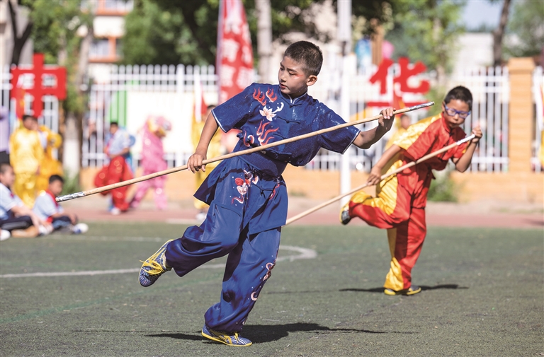 5月23日,昌吉市第二小学运动场,学生正在表演棍术。□中国昌吉网记者 何 龙摄