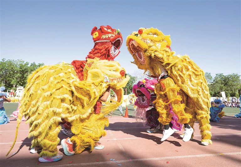 5月23日,昌吉市第二小学运动场,学生正在表演舞狮。□中国昌吉网记者 何 龙摄