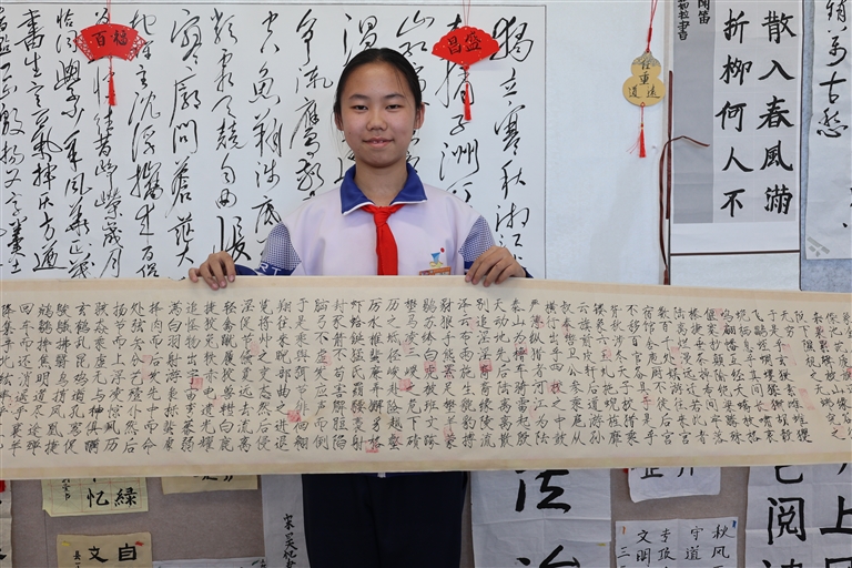班主任牛生英告诉笔者:“方晨语书写的《上林赋》将在毕业典礼上展出,并捐赠给学校收藏。《上林赋》里有一句‘驰骛乎仁义之途’,我们希望所有孩子都能像她一样,在传统文化中找到属于自己的精神家园。”