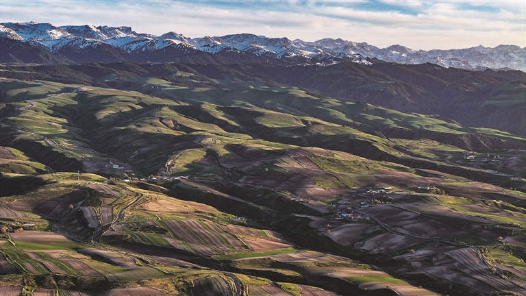 万亩旱田与远处雪山共同构成美丽奇景。记者 常谊谊摄