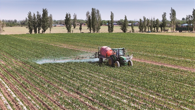 5月17日,农机在呼图壁县五工台镇幸福村的玉米地里喷洒农药。当前正值玉米生长期,当地组织农技专家深入田间地头指导种植户科学用药,防治病虫害,保障丰产丰收。记者 陶维明摄