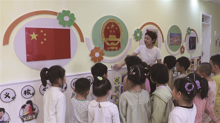 在五工台镇中心幼儿园花儿新村分园,“我爱我的祖国”主题互动展板成为孩子们的热门打卡点。该展板配备感应装置,孩子触摸展板上的国旗、国徽等图案即可听到语音讲解。